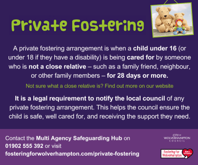 Anyone who knows of a child who is in a private fostering arrangement is asked to please call the Multi Agency Safeguarding Hub (MASH) on 01902 555392.