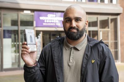 Amrik Sangha, a Health Improvement Officer with the City of Wolverhampton Council, with one of the vape kits that are available to people who want to Swap to Stop smoking