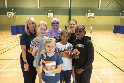 Youngsters taking part in the Yo! Active summer programme join, left to right, Lisa Johnson, Service Manager for WV Active, Councillor Obaida Ahmed, Cabinet Member for Health, Wellbeing and Community, and Grace Whiston, Community Activation Officer, Wolves Foundation, for one of the activities at WV Active Bilston-Bert Williams